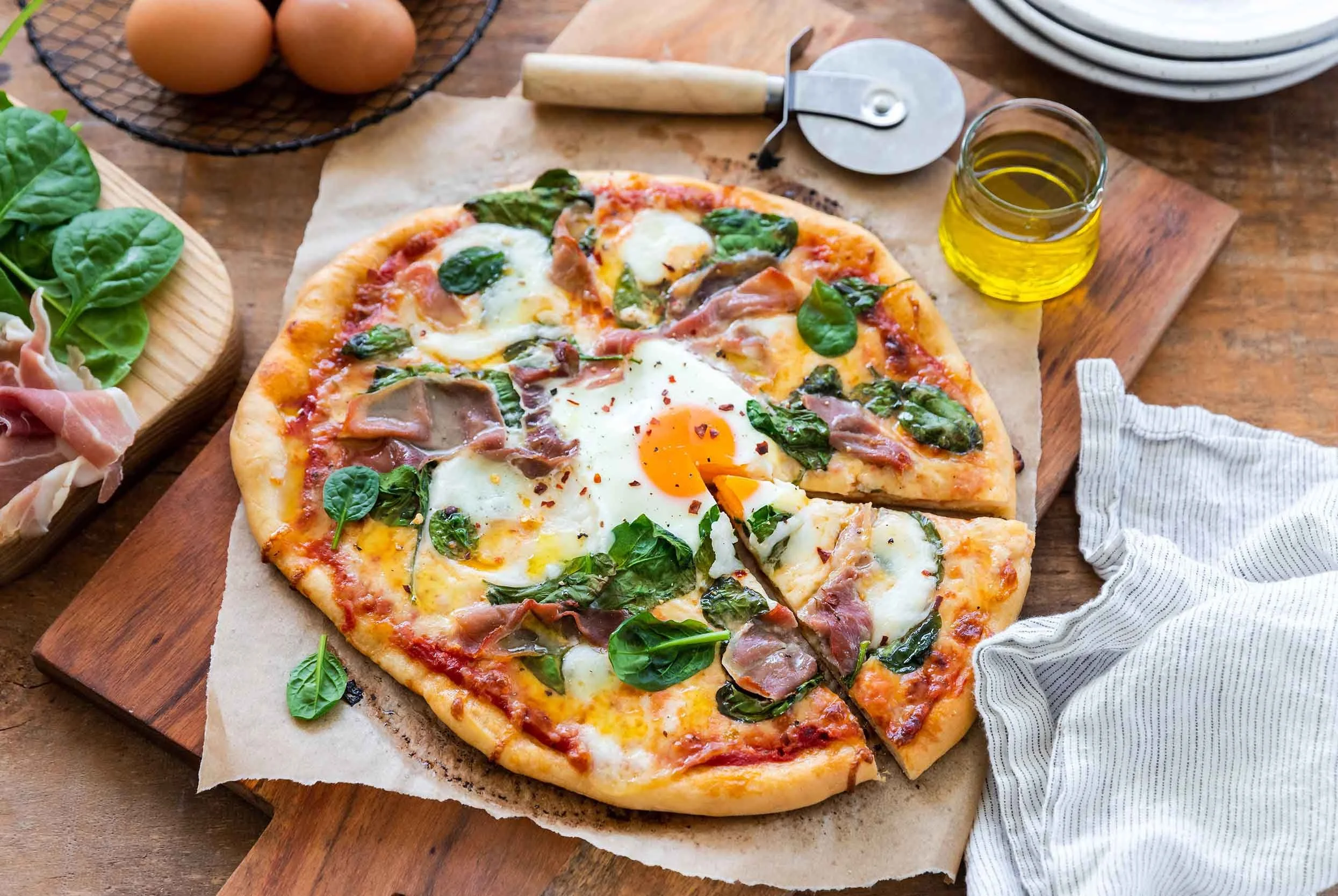 Homemade pizza is simple and incredibly satisfying to make. This delicious combination of toppings, with spinach, fresh mozzarella and prosciutto is made even better with an Otaika Valley Free Range Egg cracked on top just before it goes into the oven.